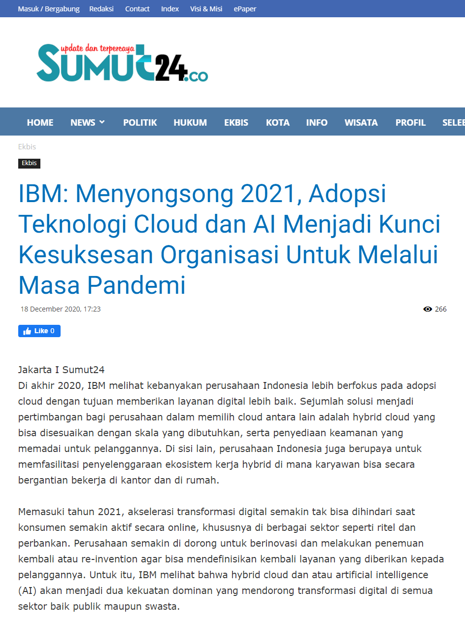 Perusahaan teknologi asal Amerika Serikat (AS) International Business Machines (IBM) memperkirakan, kecerdasan buatan atau artificial intelligence (AI), komputasi awan (cloud) dan keamanan siber masif diadopsi di Indonesia pada 2021. Ini untuk menyesua […]