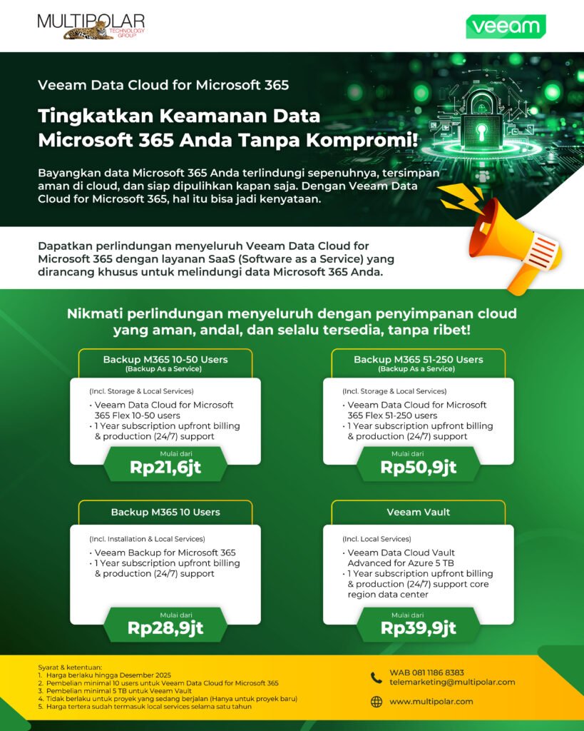 Lindungi data Microsoft 365 Anda secara menyeluruh, tersimpan aman di cloud, dan siap dipulihkan kapan saja dengan Veeam Data Cloud for Microsoft 365 sebagai Solusi layanan SaaS (Software as a Service). Dirancang khusus untuk memastikan keamanan data Anda, tersimpan aman di cloud, dan siap dipulihkan kapan saja.