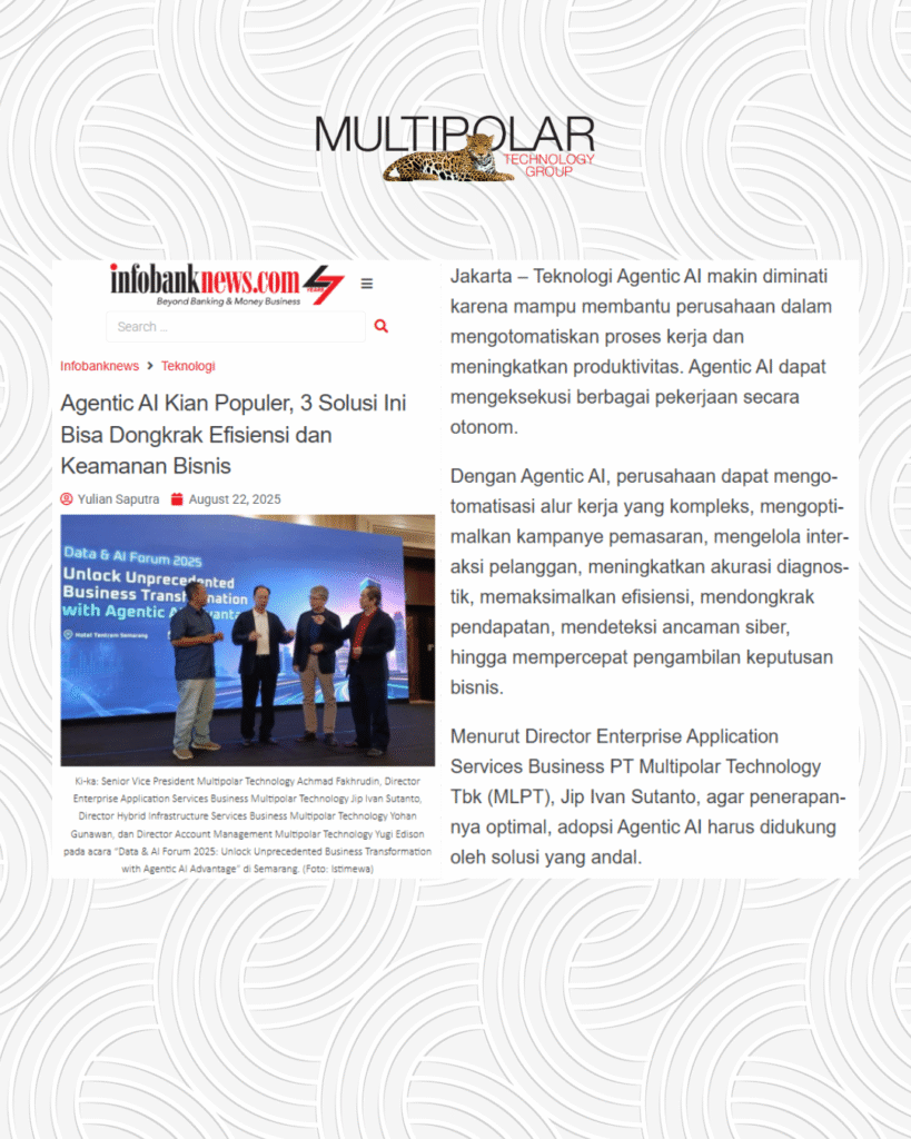 Menurut Director Enterprise Application Services Business PT Multipolar Technology Tbk (MLPT), Jip Ivan Sutanto, agar penerapannya optimal, adopsi Agentic AI harus didukung oleh solusi yang andal.