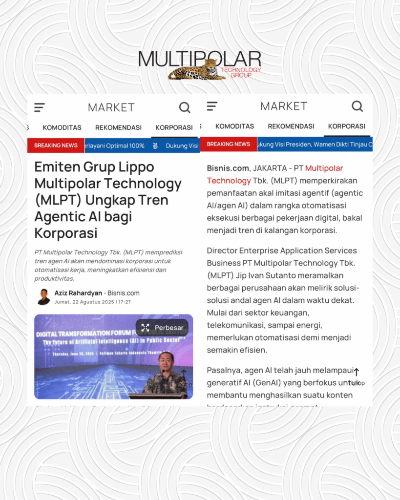 Bisnis.com, JAKARTA – PT Multipolar Technology Tbk. (MLPT) memperkirakan pemanfaatan akal imitasi agentif (agentic AI/agen AI) dalam rangka otomatisasi eksekusi berbagai pekerjaan digital, bakal menjadi tren di kalangan korporasi. Director Enterprise Application Services Business PT Multipolar Technology Tbk. (MLPT) Jip Ivan Sutanto meramalkan berbagai perusahaan akan melirik solusi-solusi andal agen AI dalam waktu dekat. Mulai dari sektor keuangan, telekomunikasi, sampai energi, memerlukan otomatisasi demi menjadi semakin efisien. Pasalnya, agen AI telah jauh melampaui generatif AI (GenAI) yang berfokus untuk membantu menghasilkan suatu konten berdasarkan instruksi prompt.
