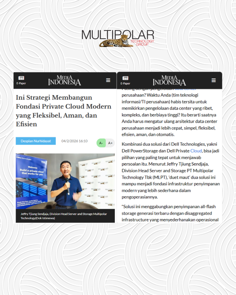 Adrian Kustiawan, Presales Server x86 Head Multipolar Technology, menjelaskan, berbeda dengan pendekatan hyperconverged tradisional, Dell Private Cloud mengusung disaggregated infrastructure yang memungkinkan skala komputasi, penyimpanan, dan jaringan dilakukan secara independen, sehingga lebih fleksibel, tanpa vendor lock-in, dan memastikan pengoptimalan sumber daya sesuai beban kerja (workload).