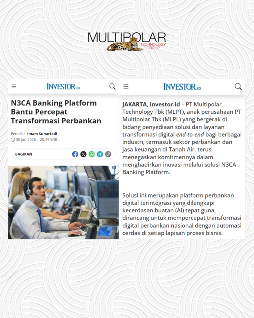 JAKARTA, investor.id – PT Multipolar Technology Tbk (MLPT), anak perusahaan PT Multipolar Tbk (MLPL) yang bergerak di bidang penyediaan solusi dan layanan transformasi digital end-to-end bagi berbagai industri, termasuk sektor perbankan dan jasa keuangan di Tanah Air, terus menegaskan komitmennya dalam menghadirkan inovasi melalui solusi N3CA Banking Platform.
