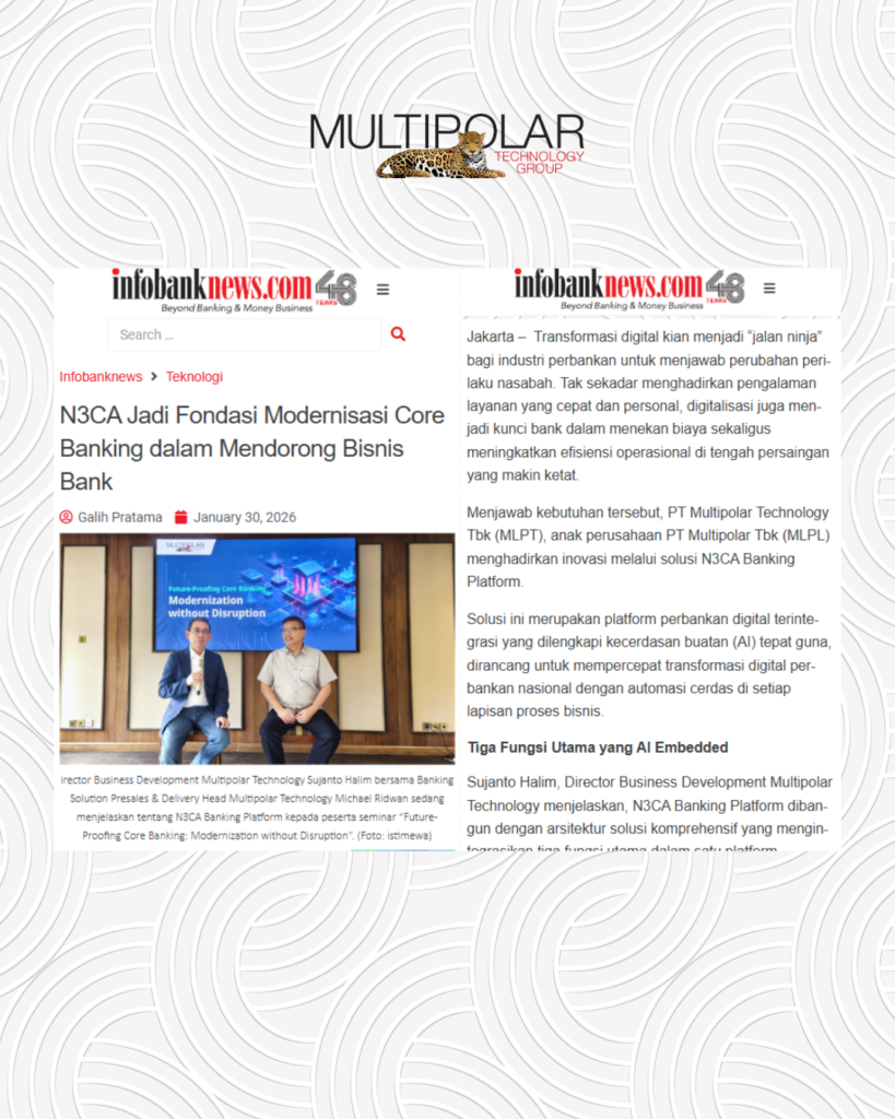 Menjawab kebutuhan tersebut, PT Multipolar Technology Tbk (MLPT), anak perusahaan PT Multipolar Tbk (MLPL) menghadirkan inovasi melalui solusi N3CA Banking Platform.