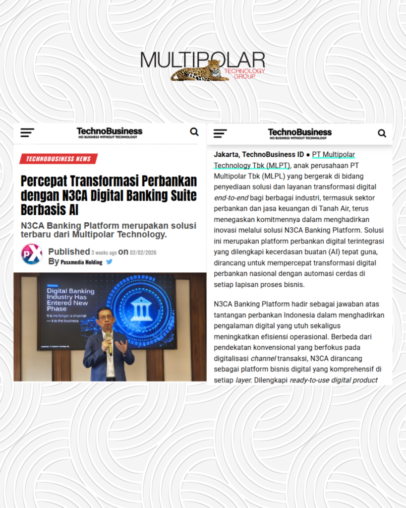 Jakarta, TechnoBusiness ID ● PT Multipolar Technology Tbk (MLPT), anak perusahaan PT Multipolar Tbk (MLPL) yang bergerak di bidang penyediaan solusi dan layanan transformasi digital end-to-end bagi berbagai industri, termasuk sektor perbankan dan jasa keuangan di Tanah Air, terus menegaskan komitmennya dalam menghadirkan inovasi melalui solusi N3CA Banking Platform. Solusi ini merupakan platform perbankan digital terintegrasi yang dilengkapi kecerdasan buatan (AI) tepat guna, dirancang untuk mempercepat transformasi digital perbankan nasional dengan automasi cerdas di setiap lapisan proses bisnis.